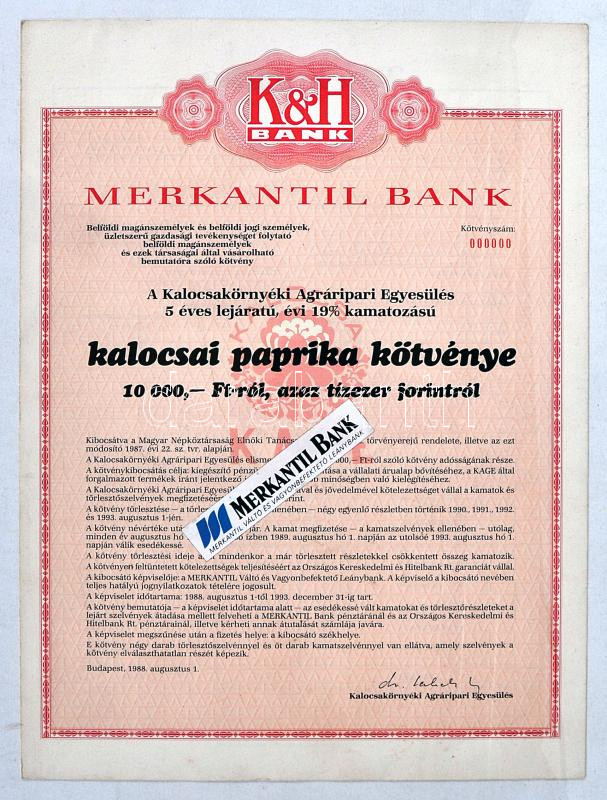 1988. "MERKANTIL BANK" A Kalocsakörnyéki Agráripari Egyesülés kalocsai paprika kötvénye 10.000Ft-ról "MINTA" 000000-ás kötvényszám
