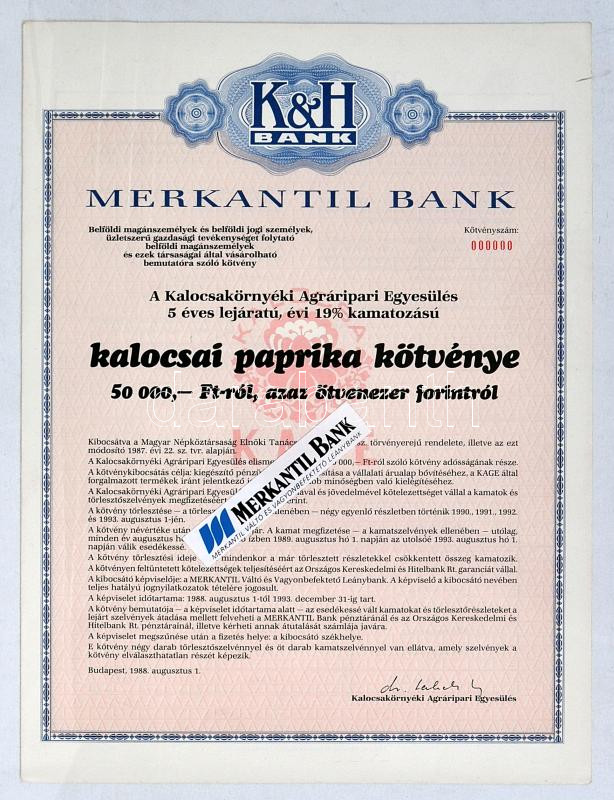 1988. "MERKANTIL BANK" A Kalocsakörnyéki Agráripari Egyesülés kalocsai paprika kötvénye 50.000Ft-ról "MINTA" 000000-ás kötvényszám