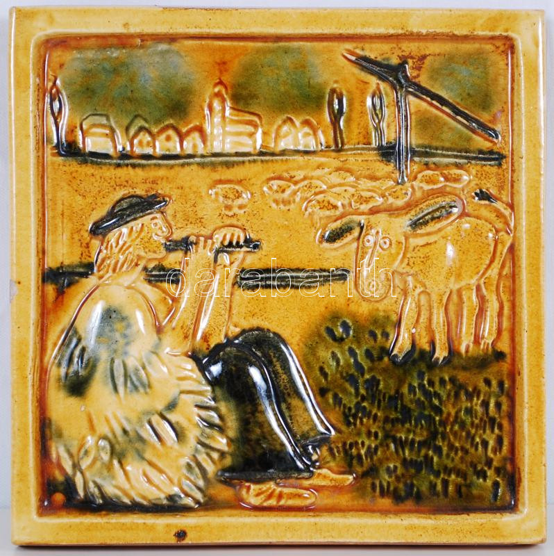Beépíthető figurális életképet ábrázoló mázas kerámia csempe, apró lepattanással, jelzett, 21×21 cm