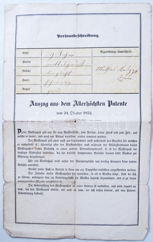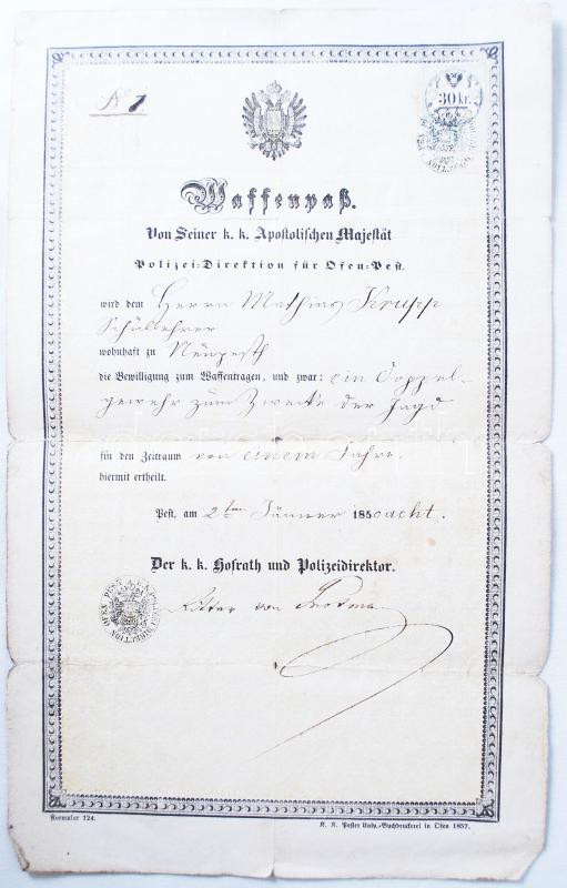 1858 A Pesti rendőrkapitányság által kiadott vadász fegyverviselési en... https://www.darabanth.com/en/181-Online-auction/181.0/Other-collectibles/Documents~200034/1858-A-Pesti-rendorkapitanysag-altal-kiadott-vadasz-fegyverviselesi-engedely-30kr-CM-okmanyb~II605842