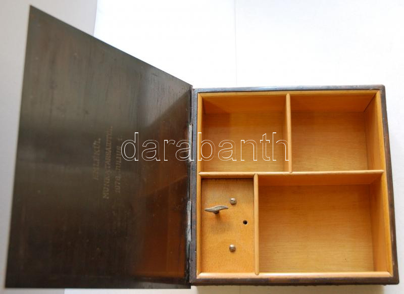 Description: Zenélő, zsűrizett iparművész rézdoboz fa betéttel, a belsejében "Emlékül munkatársaidtól 1976. julius 1." gravírozással /