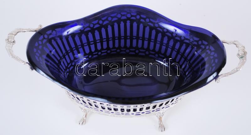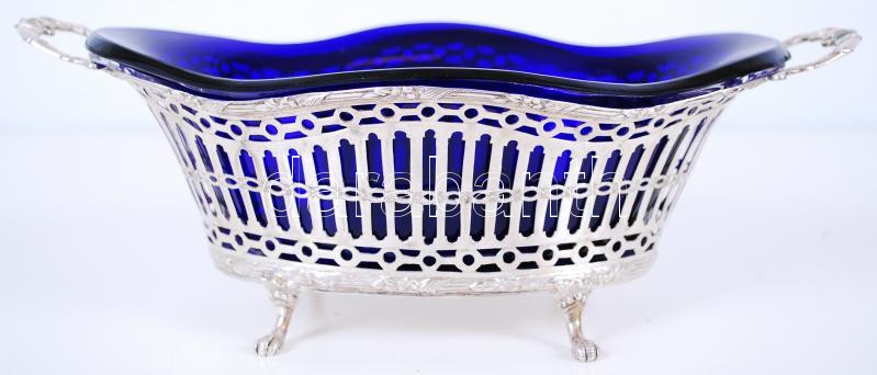 Description: cca 1900 800-as tisztaságú, jelzett, áttört ezüst (Ag) kínáló kosárka eredeti, kék üvegbetéttel /