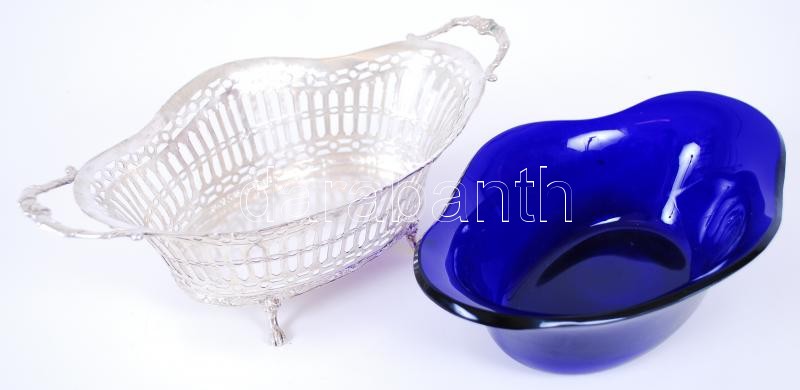 Pierced silver basket with original blue glass container, 800/1000 fineness hallmark, 26,5x14x8,5cm, 259gr