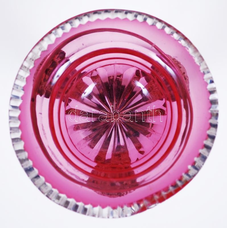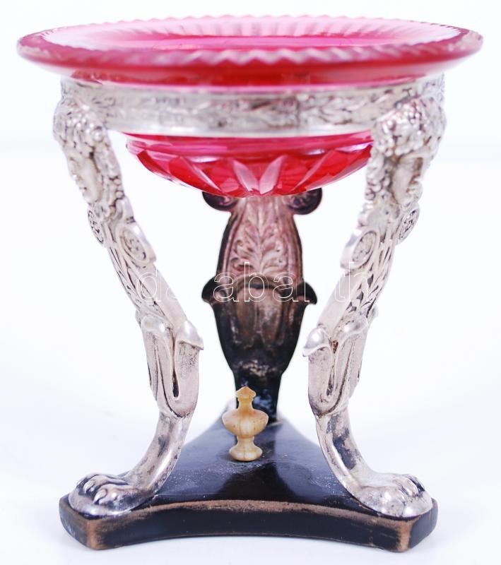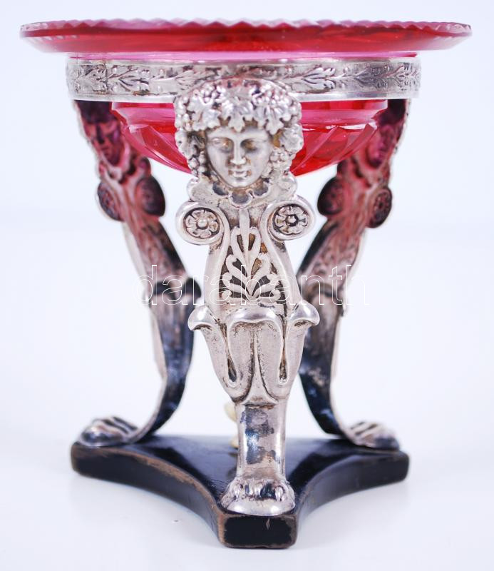 cca 1900 Bacchus-fejes, grifflábakon álló, poncolt ezüst (Ag) fűszertartó eredeti, színes üvegbetéttel, fa talapzaton /