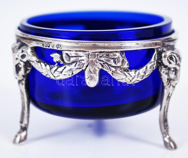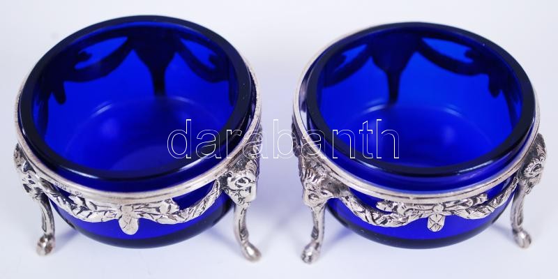 Silver salts with ram's heads, 800 fineness German "crescent and crown" hallmark, with original, blue glass containers, 5x3,5cm, 29,3+28,6gr