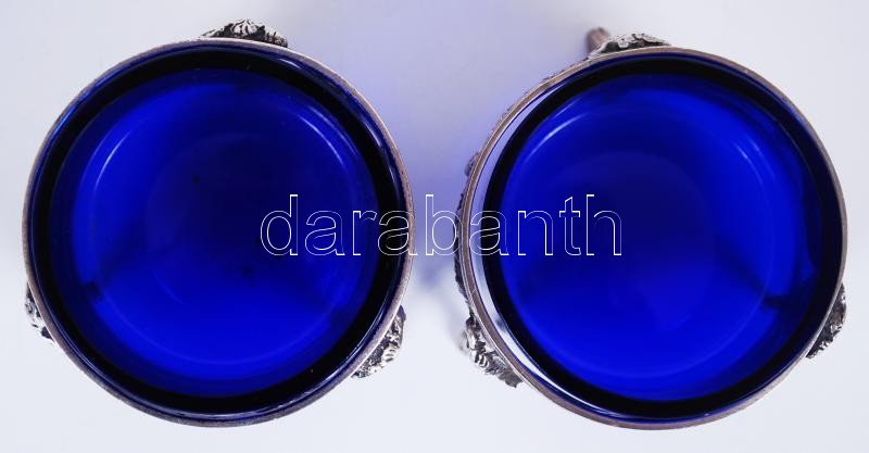 cca 1900 Kosfejekkel díszített, 800-as tisztaságú, német hold-korona jelzéssel ellátott, ezüst (Ag) fűszertartó pár eredeti, kék üvegbetéttel /