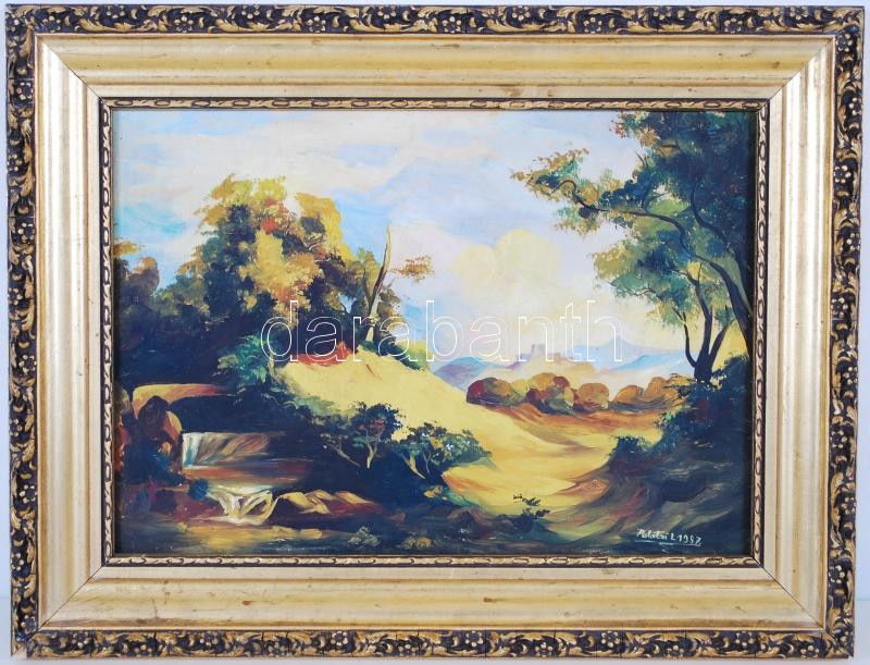 Palotai L. jelzéssel: Mitológia táj, olaj, farost, kereteben 31×40 cm