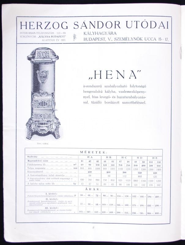 1930 Budapest V. Árjegyzék ir-rendszerü folytonégő hengeres alaku lemezköpenyes kályhákról