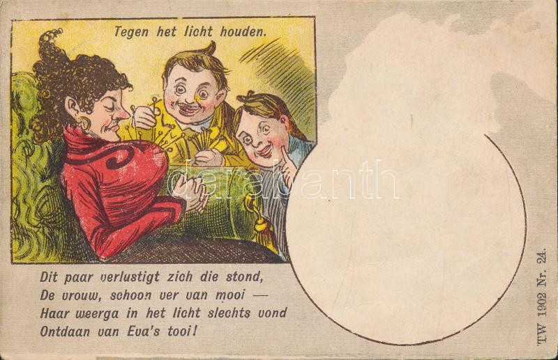 Erotic humour, stripping of the woman, hold to light (small tear)