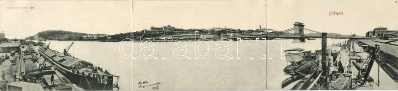 1899 Budapest panorámalap, kikötői rakodás (lyuk / pinhole)