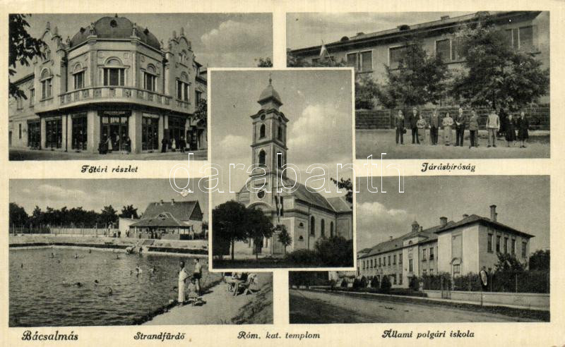 Bácsalmás Fő tér, járásbíróság, strand, polgári iskola, templom
