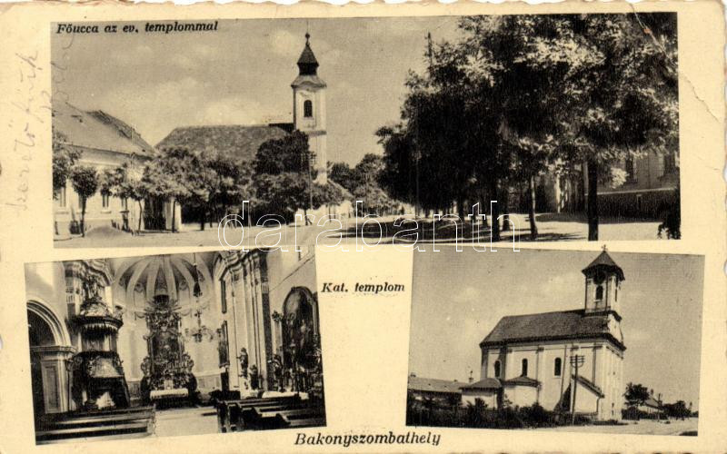 Bakonyszombathely Fő utca, katolikus és evangélikus templom (fa)
