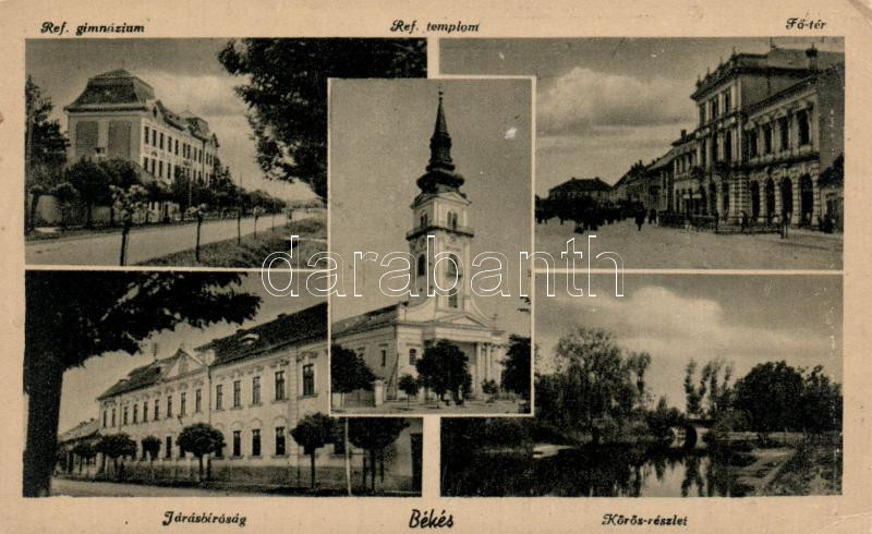 Békés Fő tér, gimnázium, járásbíróság, Kőrös part, református templom ...