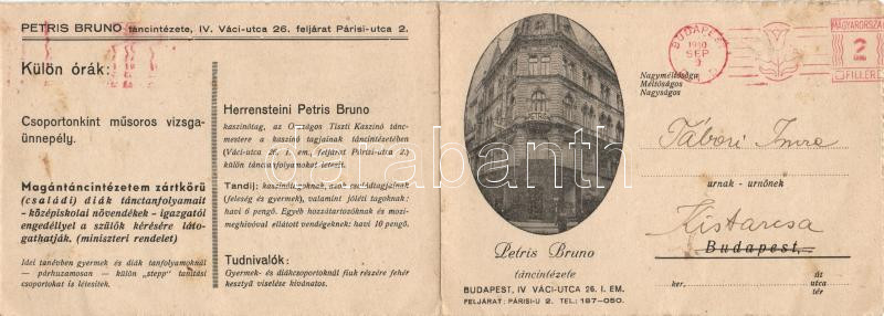 Budapest V. Váci utca 26., Petris Bruno táncintézete, az intézet közleményei, összecsukható képeslap / folding card (fa)