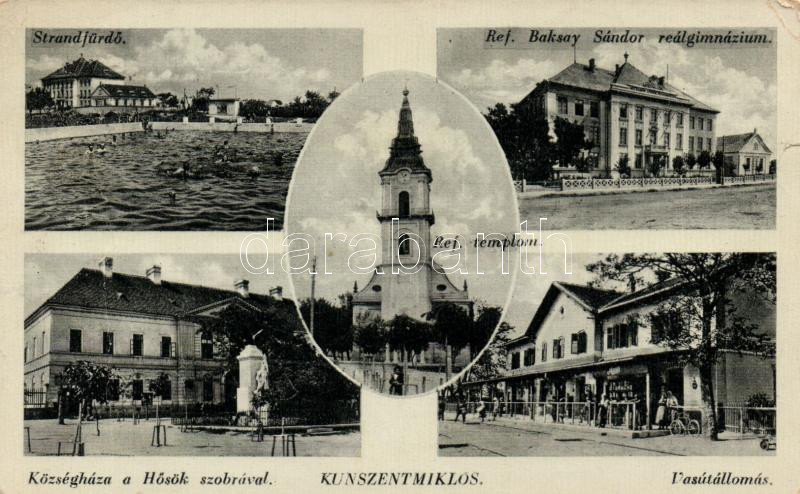 Kunszentmiklós Baksay Sándor Gimnázium, vasútállomás, strand, községháza a Hősök szobrával, református templom (b)