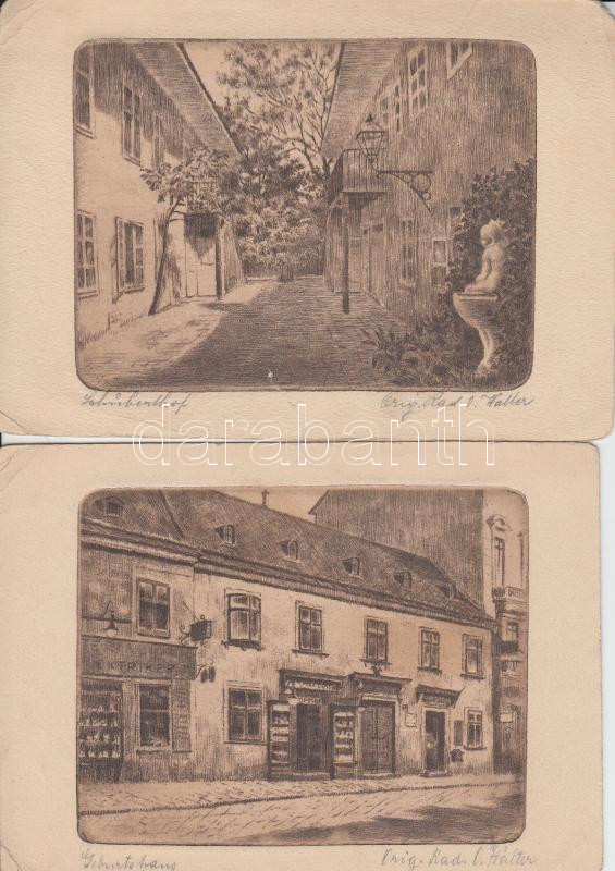 Bécs, Wien - Schuberthof és Schubert szülőháza, 2 db rézkarc képeslap Rad. O. Walter szignóval / 2 etching postcards