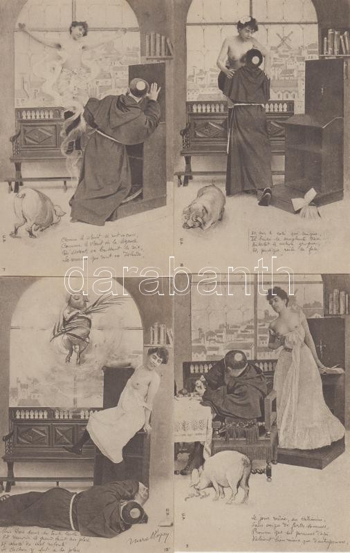 Szerzetes és feslett nő - 9 darabos kihívó, háború előtti erotikus képeslapsorozat / Series of 9 erotic cards, the Monk and his Mistress