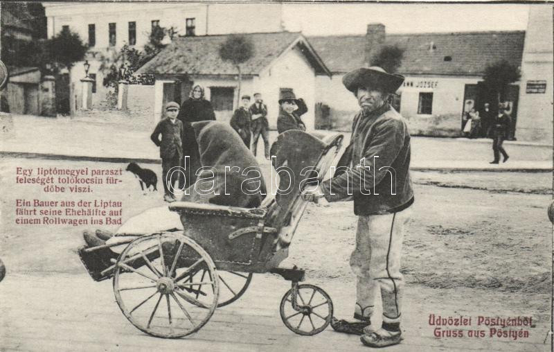 Pöstyén; egy Liptó megyei paraszt feleségét tolókocsin fürdőbe viszi / carriage, peasant folklore (cut)