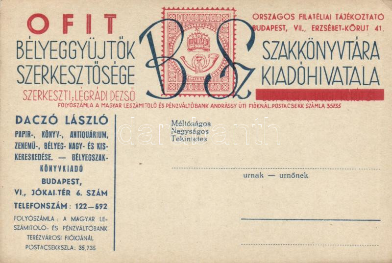 Országos Filatéliai Tájékoztató, Bélyeggyűjtők Szerkesztősége, Daczó L... https://www.darabanth.com/en/181-Online-auction/181.0/Postcards/Stamps~1000299/Orszagos-Filateliai-Tajekoztato-Belyeggyujtok-Szerkesztosege-Daczo-Laszlo-kereskedes~II646620