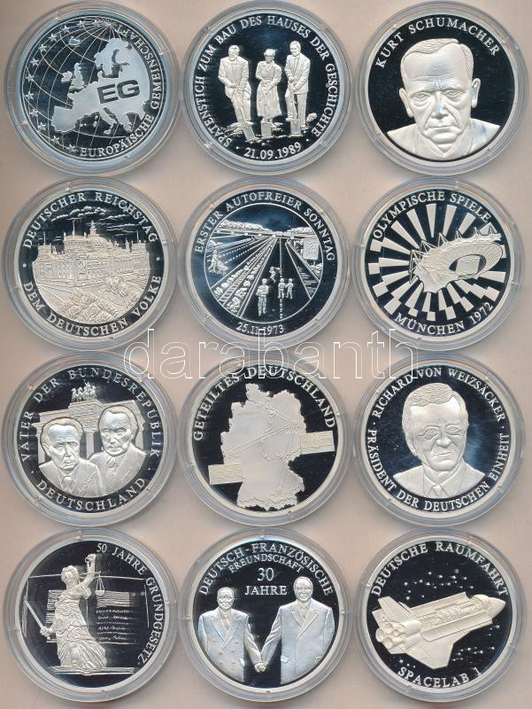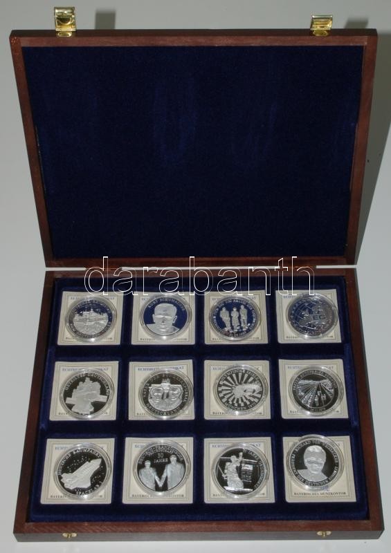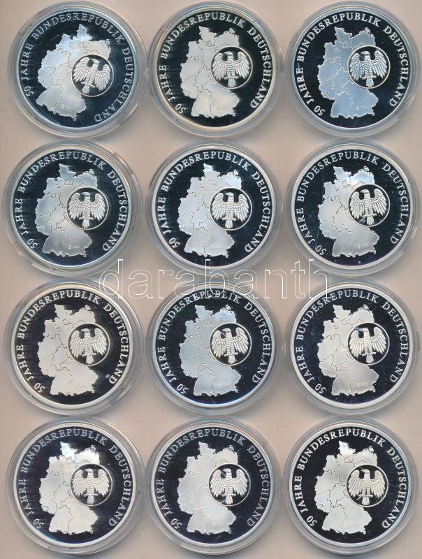 Németország 1993-94. "Német Szövetségi Köztársaság 50 éve" Ag(0.999) emlékérem (20g/40mm) sorozat 24 különféle darabja fa mahagóni éremtartó kazettában sorszámozott tanúsítványokkal T:PP
