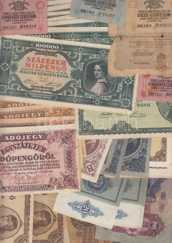 Description: Vegyes bankjegy tétel, főleg magyar papírpénzekkel, közte 1848. 5Ft Kossuth-bankó, koronák, pengők, inflációs pengők és néhány külföldi bankjegy, összesen 113db T:vegyes