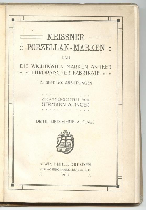 Description: Herman Alinger: Meissner Porzellan-marken und die wichtigsten Marken antiker Europäischer Fabrikate in über 300 Abbildungen. Dresden, 1913. Alwin Huhle. Meisseni porcelánjelzések 34p.