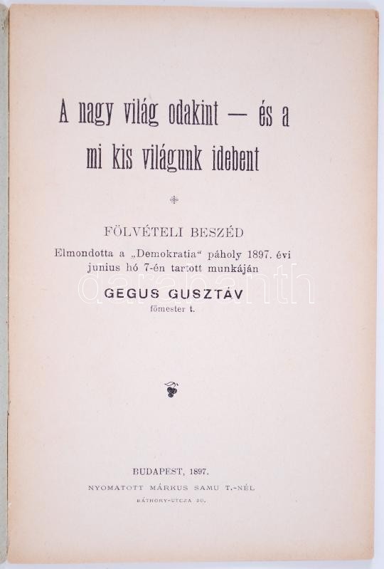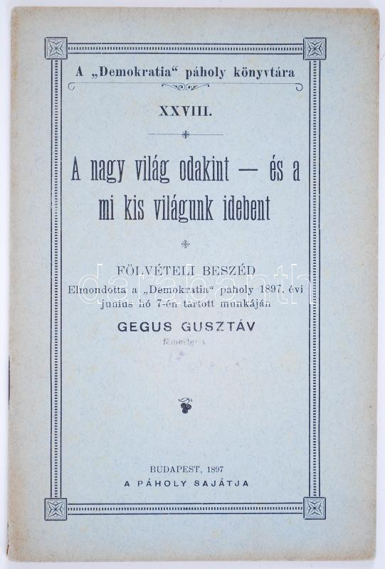 Description: A "Demokratia"-páholy könyvtára XXVIII.: Gegus Gusztáv: A nagy világ odakint - és a mi kis világunk idebent. Fölvételi beszéd. Bp., 1897, A páholy sajátja. Fűzve, 18p