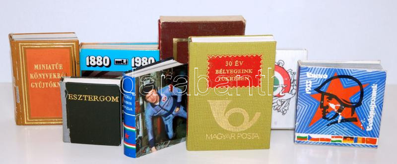 Description: 8 db minikönyv vegyes témákkal: Magyar festészet a XX. században, Miniatűr könyvekről gyűjtőknek, Esztergom, Magyar Posta, Magyar Posta és az UPU, Az MTI száz éve, Valerij Rjumlin naplója, Védőpajzsunk