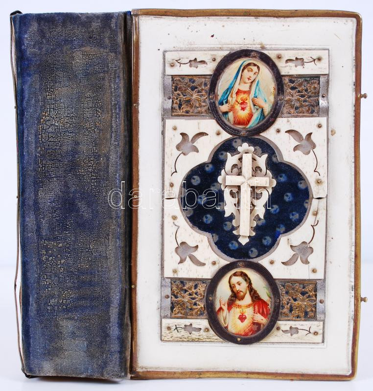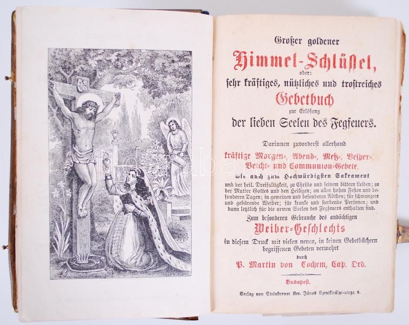 Martin von Cochem: Großer goldener Himmel-Schlüssel, oder: sehr kräftiges, nützliches und trostreiches Gebetbuch zur Erlösung der lieben Seelen des Fegfeuers. Bp., [1907], Steinbrener Ker. János. Félvászon kötésben, az első kötéstábla faragott csontberakással, lito szentképekkel, és aranyozott bronzberakásokkal gazdagon díszített, körben aranyozott bronz kerettel, csatokkal, kissé kopottas állapotú, a hátsó kötéstábla sérült /