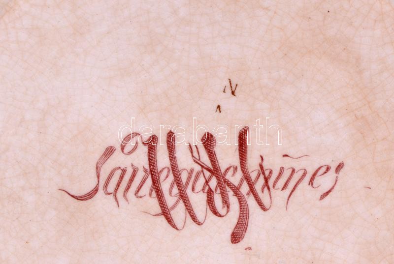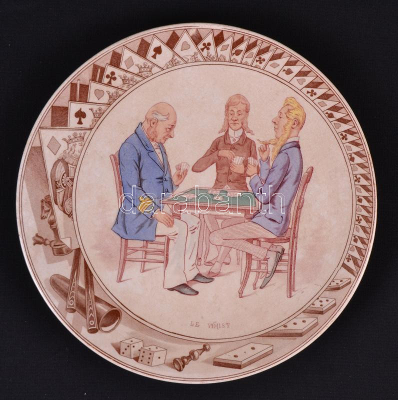 Francia Sarreguemines fajansz dísztányér, jelzett, hibátlan, 1850-1900 közötti, d:21,5 cm. A dísztányér sorozat a korabeli szerencse játékokat mutatta be a tányér szélén képek is vannak erről, sakk, kocka, kártya, dominó stb. "Le Whist" címmel az egyik ilyet mutatja be ez a nagyon ritka gyűjtői darab. / cca 1850 Rare fayance plate depicting gambling in the XIXth century. Chess, cards, domino. Sarreguemines, France.