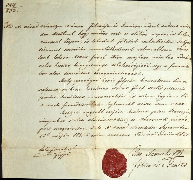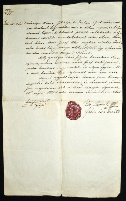 1850 a nagyváradi városi tanács igazolása hogy az illető a szabadságha...