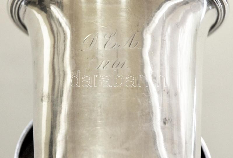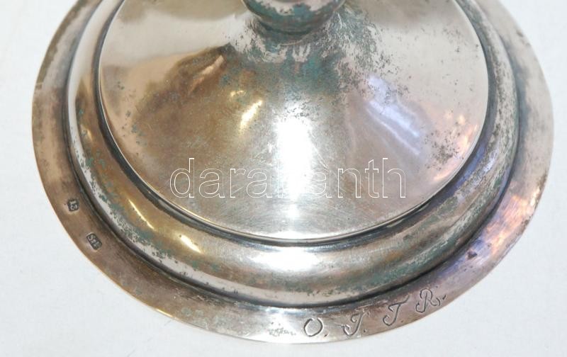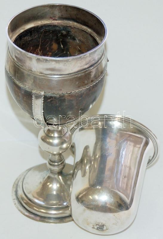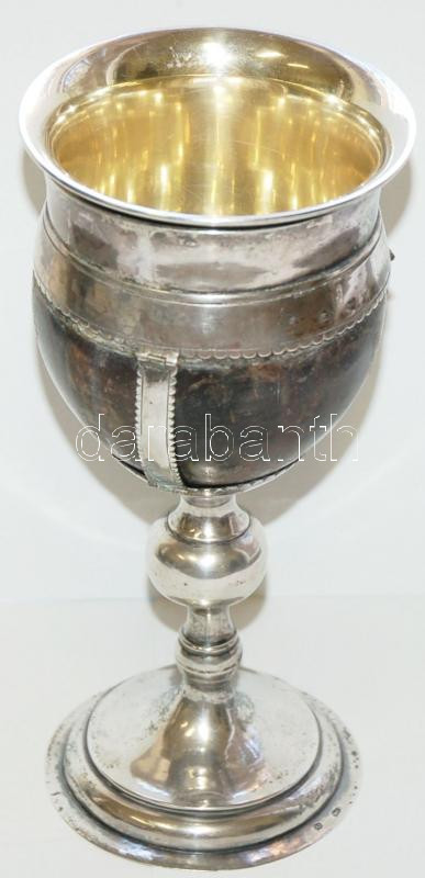 Before 1867 Silver chalice with horn inlay, hallmarked with 13 lot purity mark and Sz.I. maker's mark, plus a gold plated silver container with "D.E.A. 1861" engraving 24cm, br: 400gr and 180gr