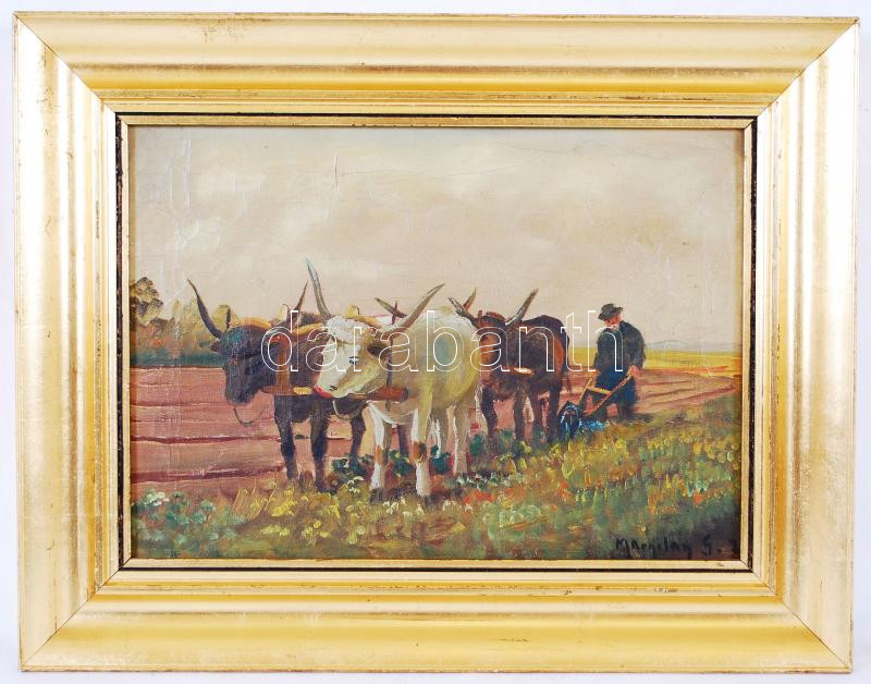 Margitay G.J. jelzéssel: Szántás, olaj, vászon, szép keretben 35×45 cm