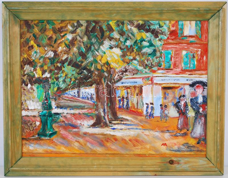 NA jelzéssel: Utcakép kúttal. Olaj, farost, szép keretben, 30×40 cm