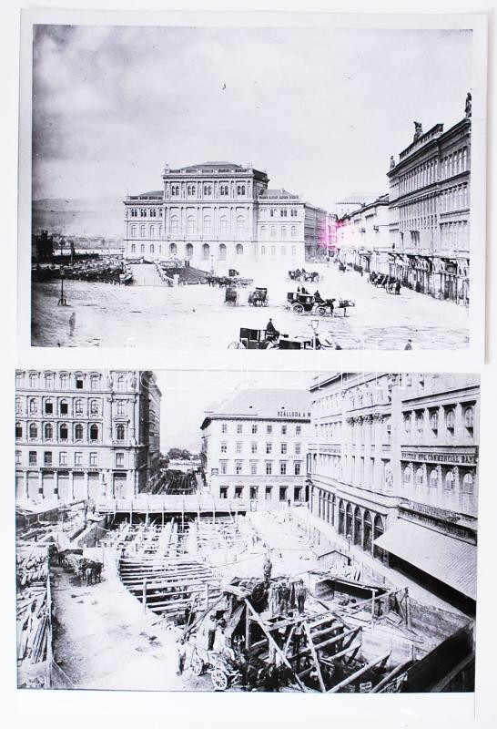 2 db régi pesti felvétel mai nagyítása a földalatti építéséről, a koronázódombról, bérkocsikról 18x24 cm