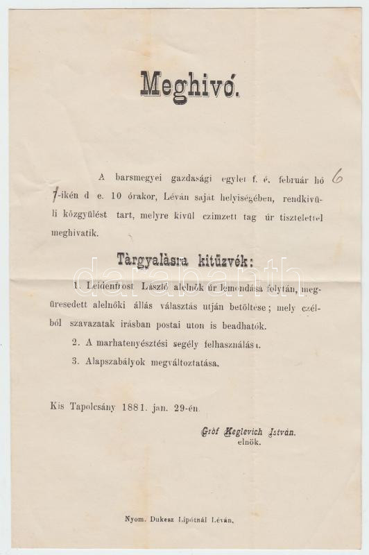https://www.darabanth.com/en/182-Online-auction/182.0/Other-collectibles/Printed-Materials~400039/1881-Meghivo-a-Barsmegyei-Gazdasagi-egylet-kozgyulesere-nyomtatvanykent-elkuldve~II640418