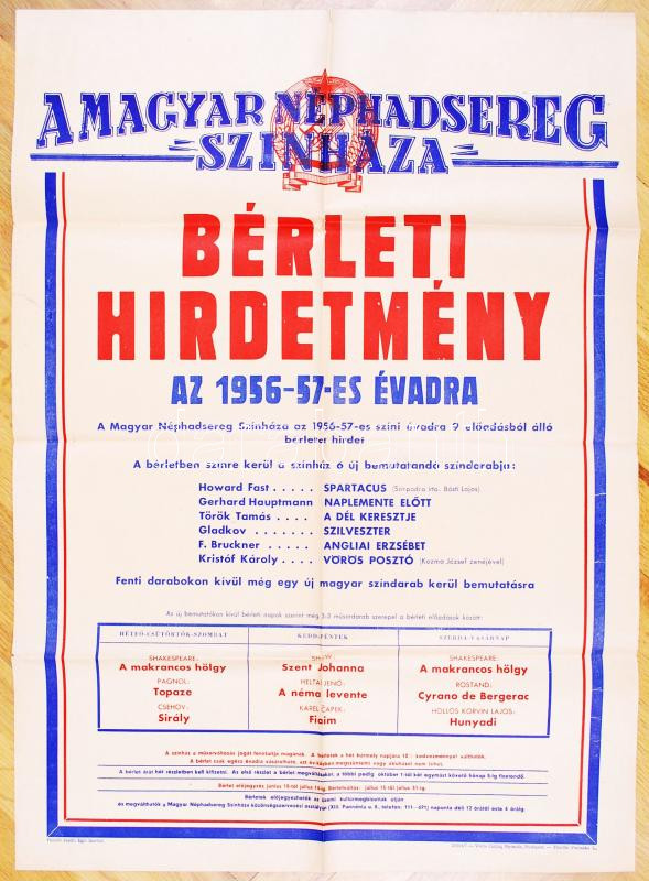 1956-1957 Magyar Néphadsereg Színház bérleti hirdetménye, hajtott, kis...
