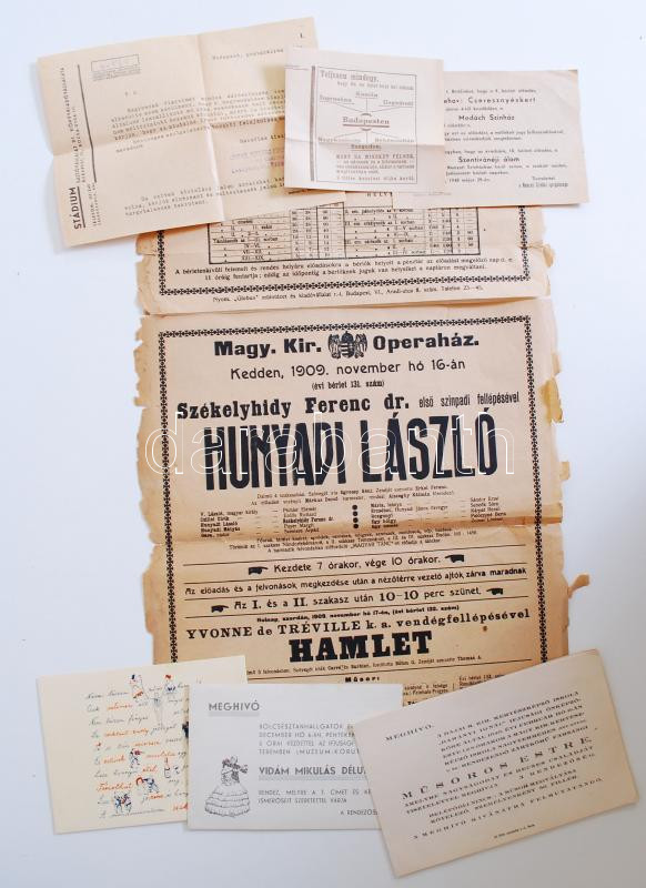 cca 1910-1950 Kis nyomtatvány tétel: plakát Székelyhidi Ferenc első színpadi fellépéséről Hunyadi László címszerepében, meghívók, stb.