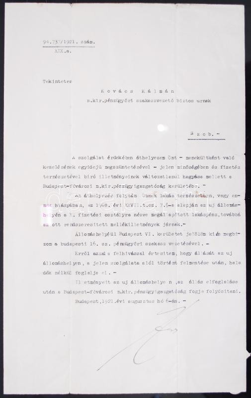 1921 Kinevezési dokumentum Hegedüs Lóránt pénzügyminiszter saját kezű aláírásával