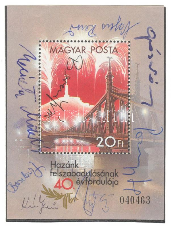 1985 Felszabadulás 40. évfordulója kisív Grósz Károly, Pozsgay Imre, Berecz János, Nyers Rezső, Németh Miklós és más politikusok aláírásával