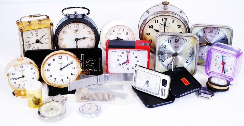 Óra tétel cipős dobozba: 11 db asztali ébresztő óra, 1 db karóra és zs...