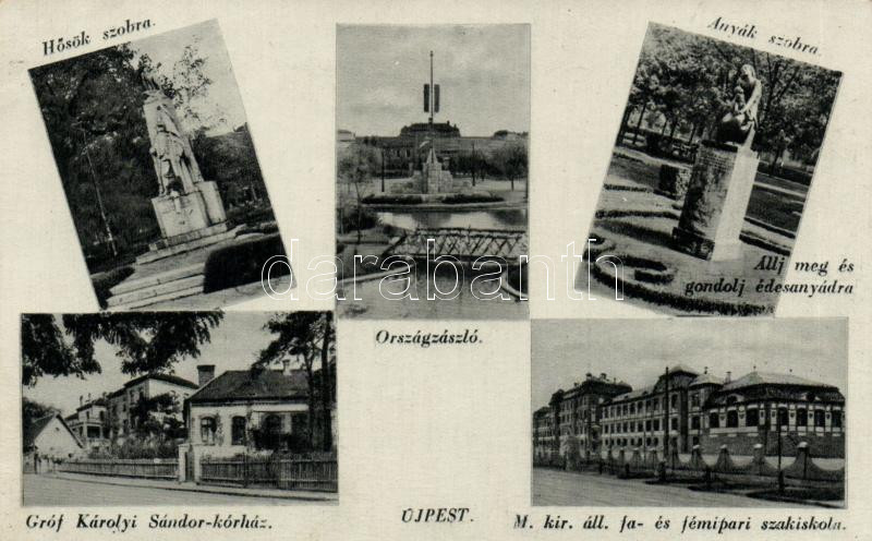 Budapest IV. Újpest; Gróf Károlyi Sándor Kórház, ipari szakiskola, anyák szobra
