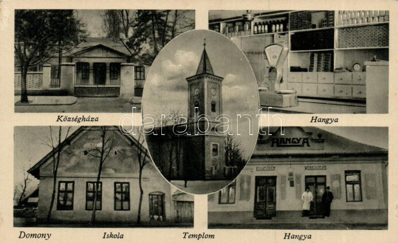 Domony Hangya szövetkezet belsővel, községháza, iskola, templom