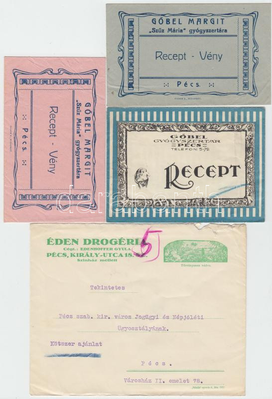 XX sz eleje: Pécs Gőbel gyógyszertár 3 db receptboríték + egy reklámos boríték