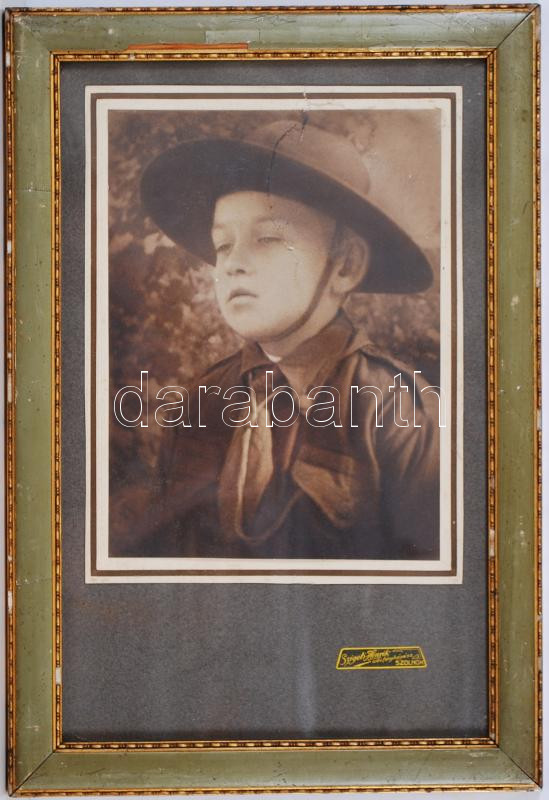 Régi keret cserkész fotóval (szakadt), 40×28 cm
