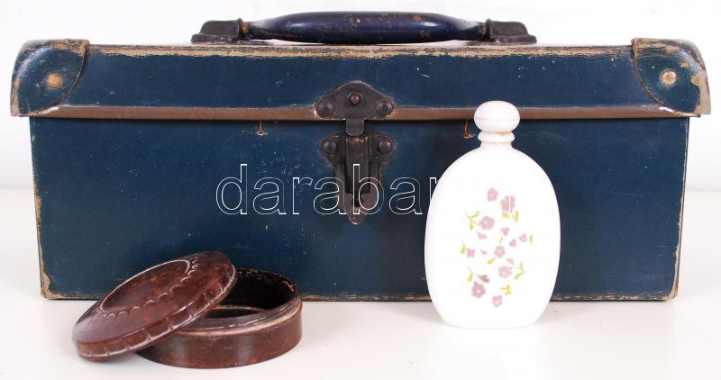 Régi kuffer, Avon illatszeres üvegcsével és bakelit púdertartóval, 30×...