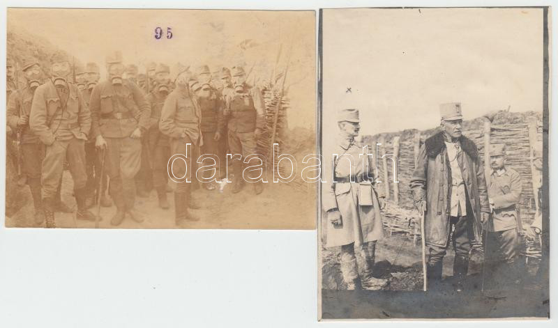 1916 2 db fotó: Szurmay Sándor altábornagy és Szász Ágoston alezredes; gázálarcos katonák, 9x12cm