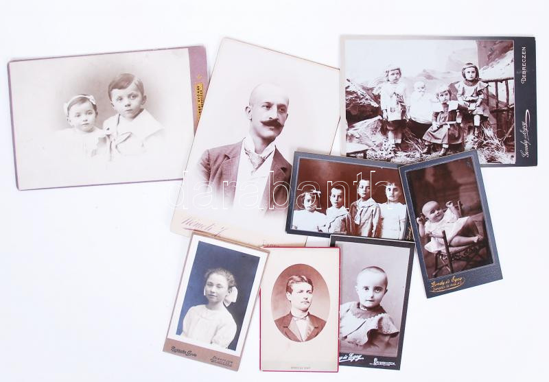 Description: cca 1900 8db keményhátú fotó különféle debreceni műtermekből (Gondy és Egey, Ruzicska Gyula, Lovag Chylinski György etc.), vizitkártya és kabinetfotó méretben /