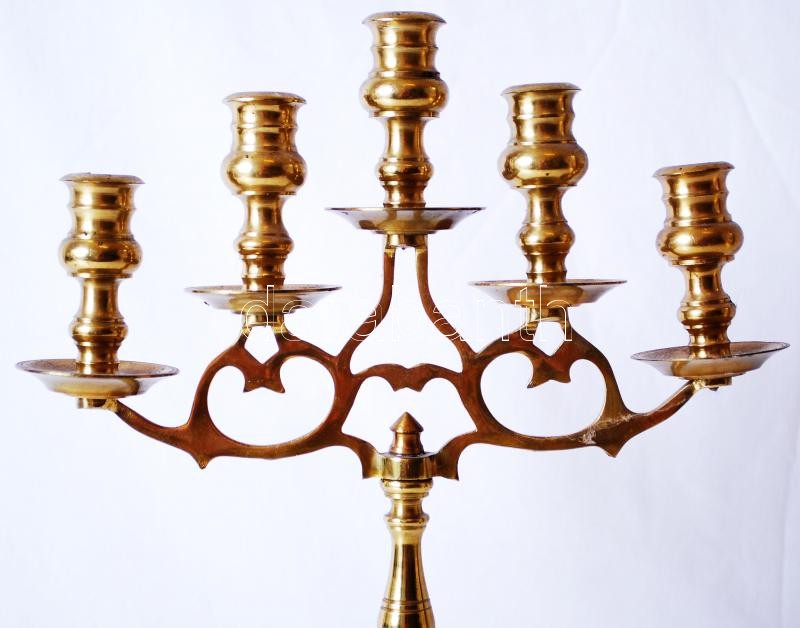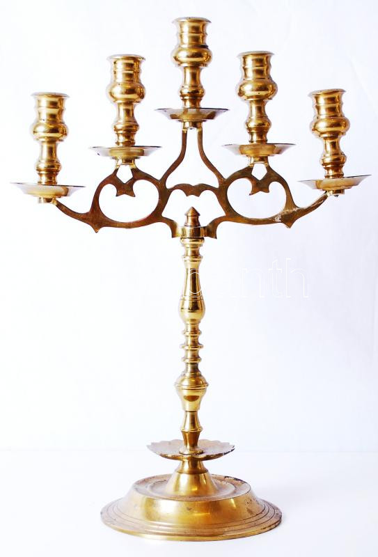 Ötágú modern gyertyatartó, réz, jó állapotban, m:38 cm /Brass candlestick
