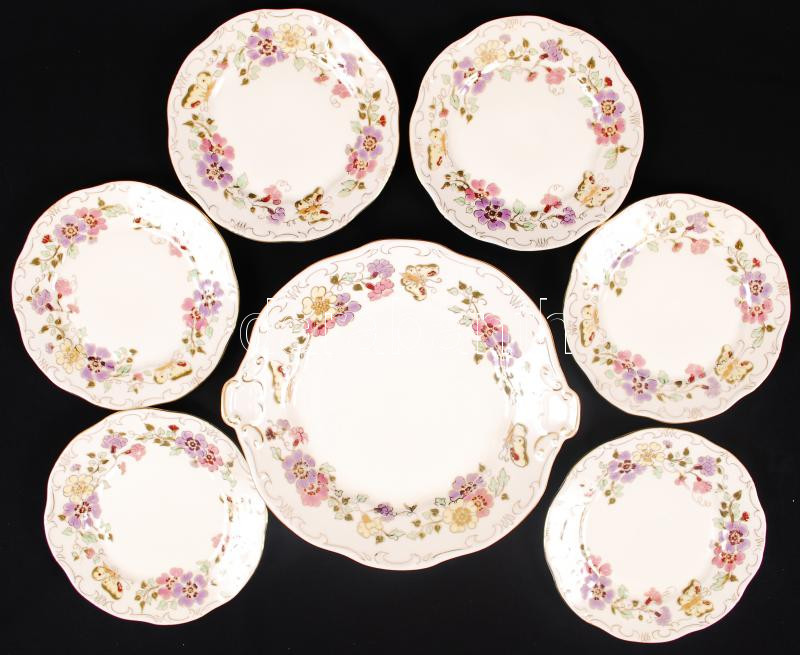 Zsolnay pillangó mintás süteményes készlet, kézzel festett, jelzett, hibátlan, összesen: 7db / Zsolnay cake set
